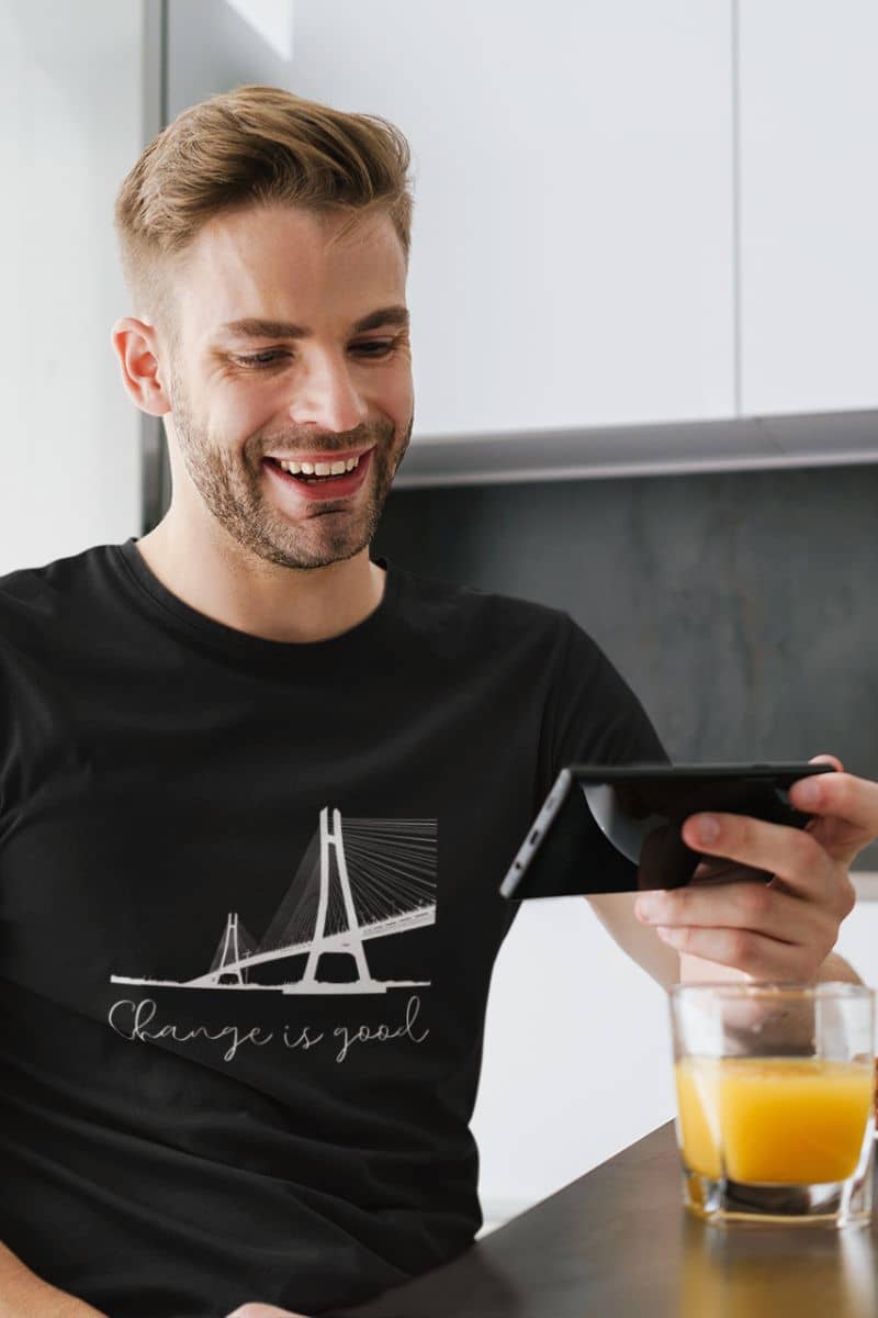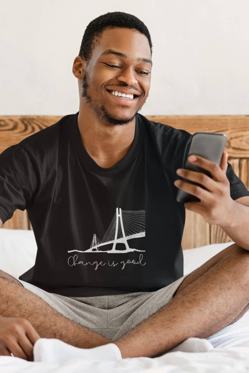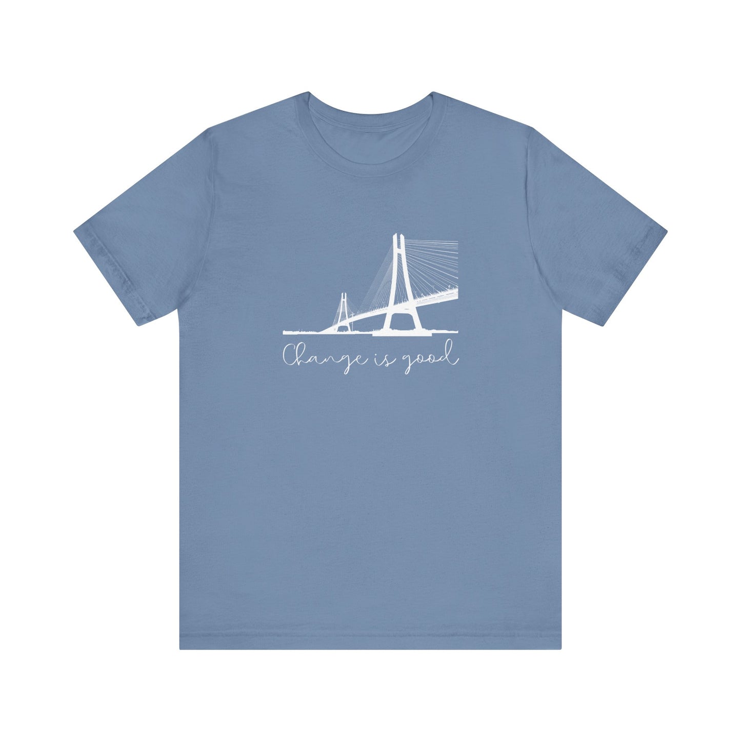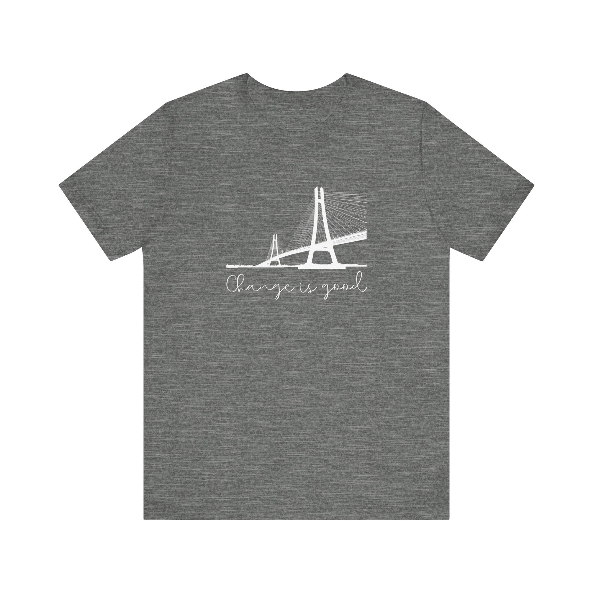This beautifully designed t-shirt features a serene image of a bridge symbolizing transition and growth, with the handwritten phrase "Change is Good" elegantly placed below.