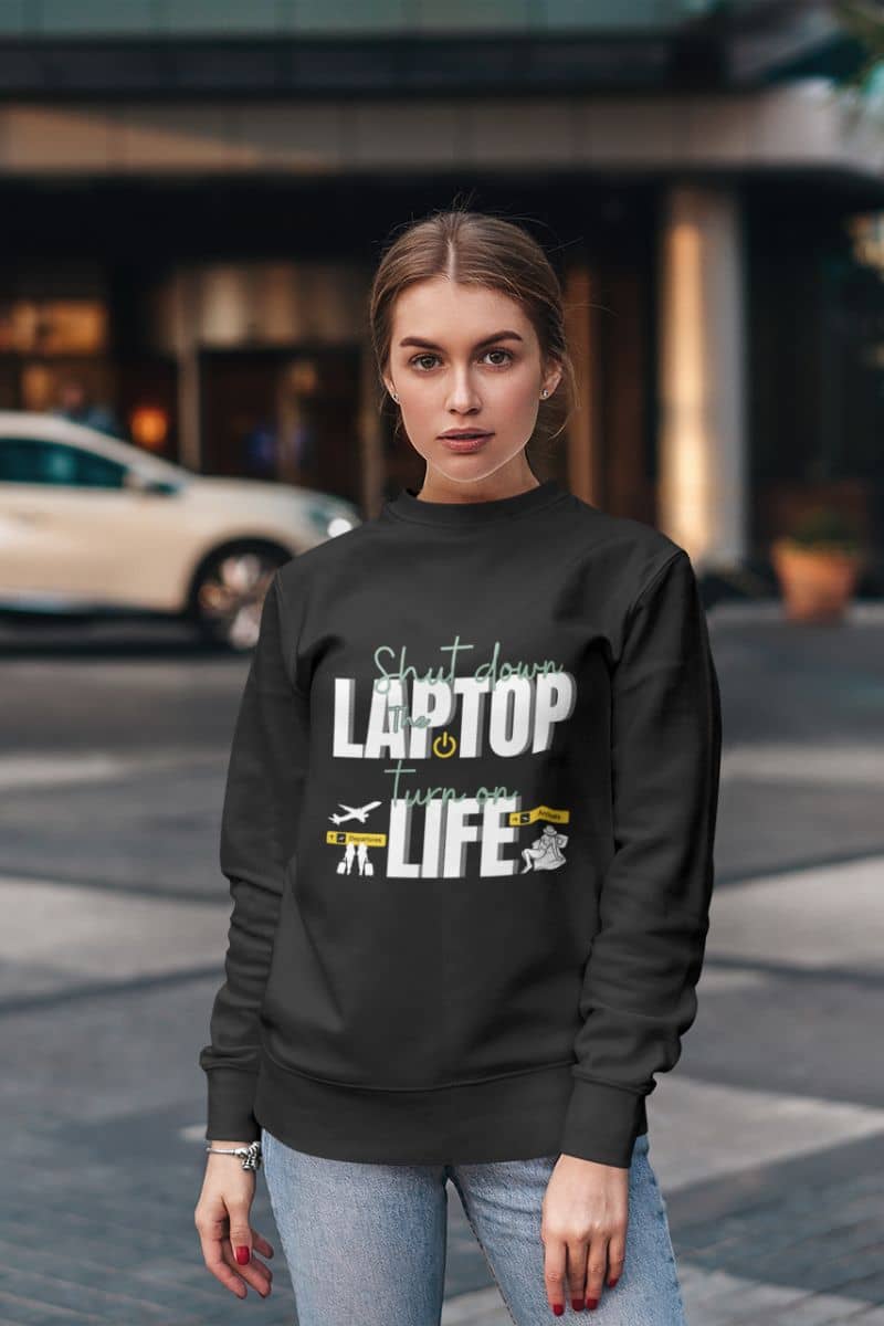This design is more than just a sweatshirt—it’s a lifestyle reminder. The power button icon between "Laptop" and "Life" visually represents the transition from work mode to relaxation mode.