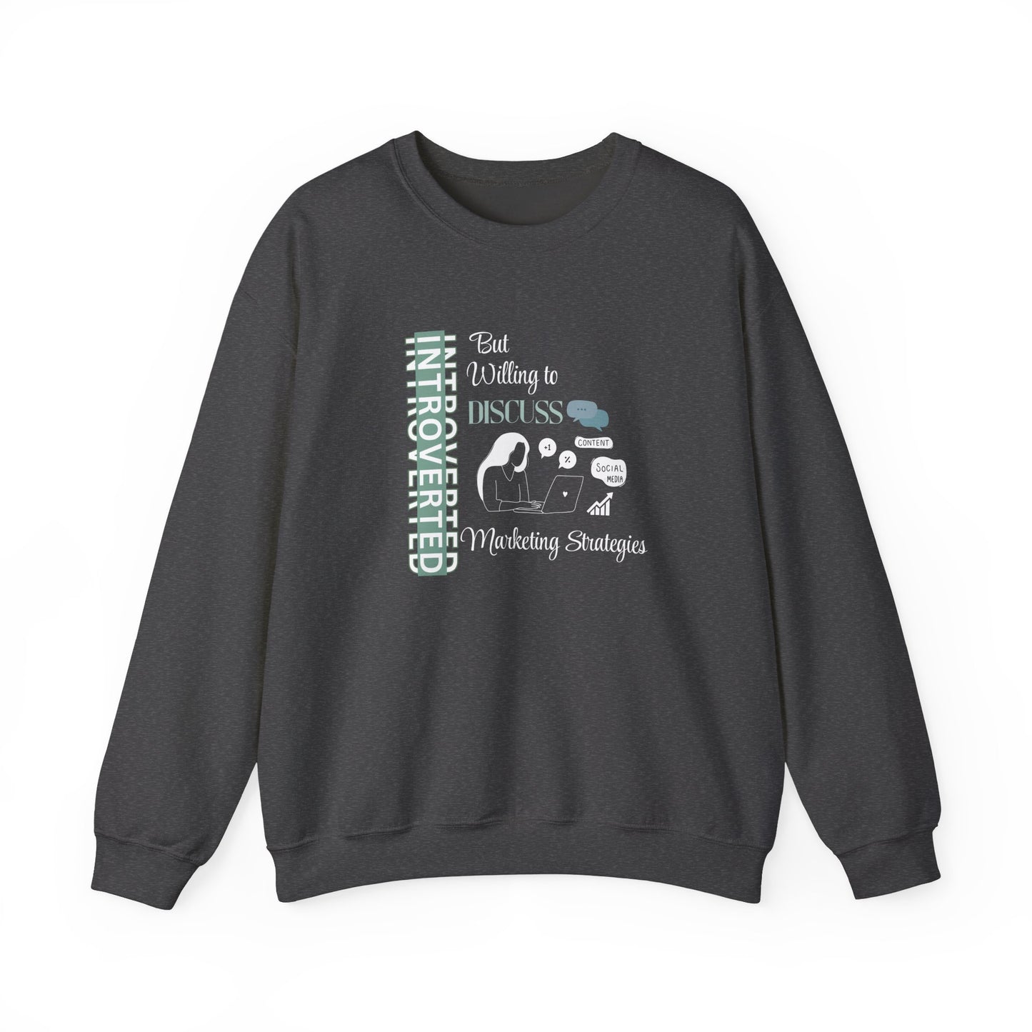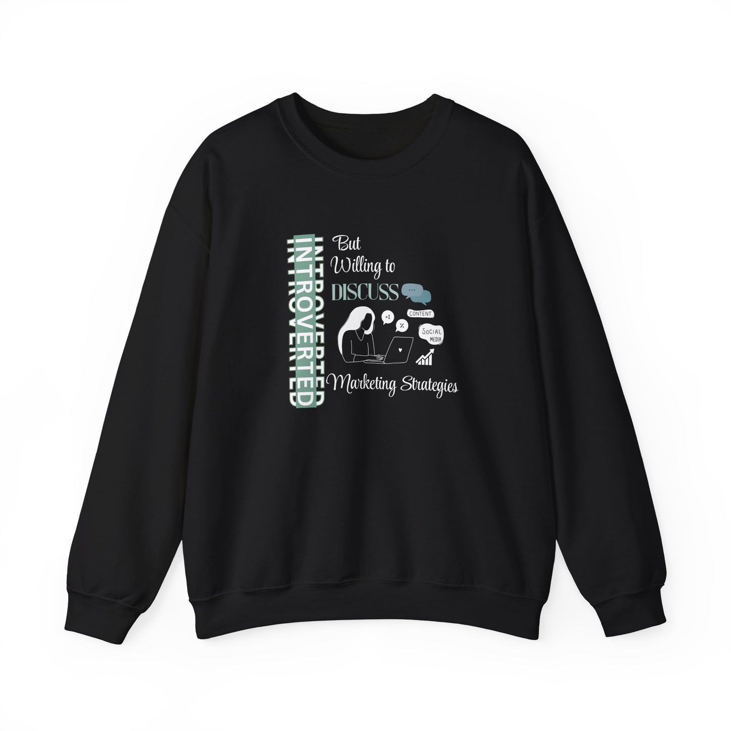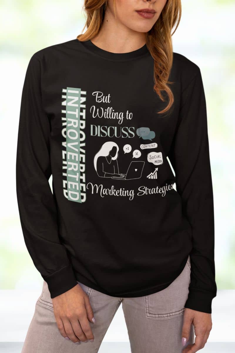 The design features a bold vertical "Introverted" stacked cleanly to one side, with the phrase "But Willing to Discuss Marketing Strategies" flowing in a delicate, hand-lettered script. It’s balanced, elegant, and quietly humorous—exactly like you.