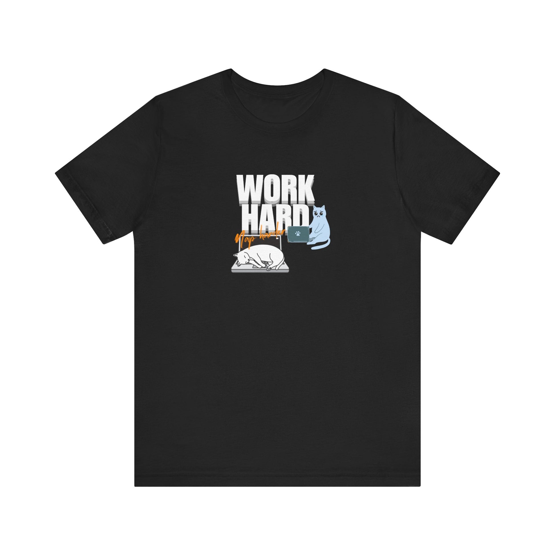 Do you hustle all day, meeting deadlines, only to crash like a sleepy cat on your laptop? Then our work hard, nap harder T-Shirt is just what you need! Whether you're a freelancer, an office warrior, or a devoted nap enthusiast, this tee speaks your truth – work hard, but never underestimate the power of a good nap.