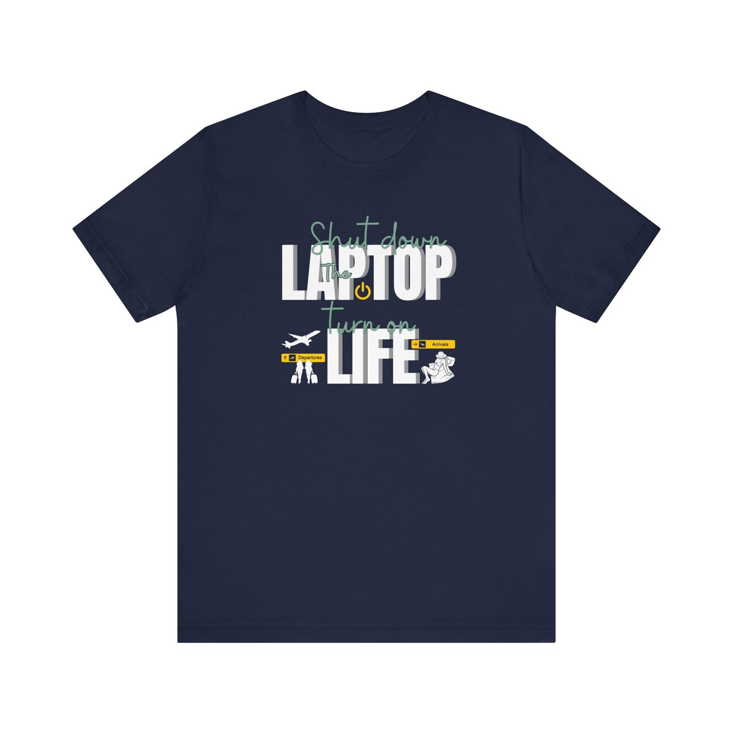 Work-Life Balance Tee | Shut Down the Laptop, Turn On Life Graphic T-Shirt