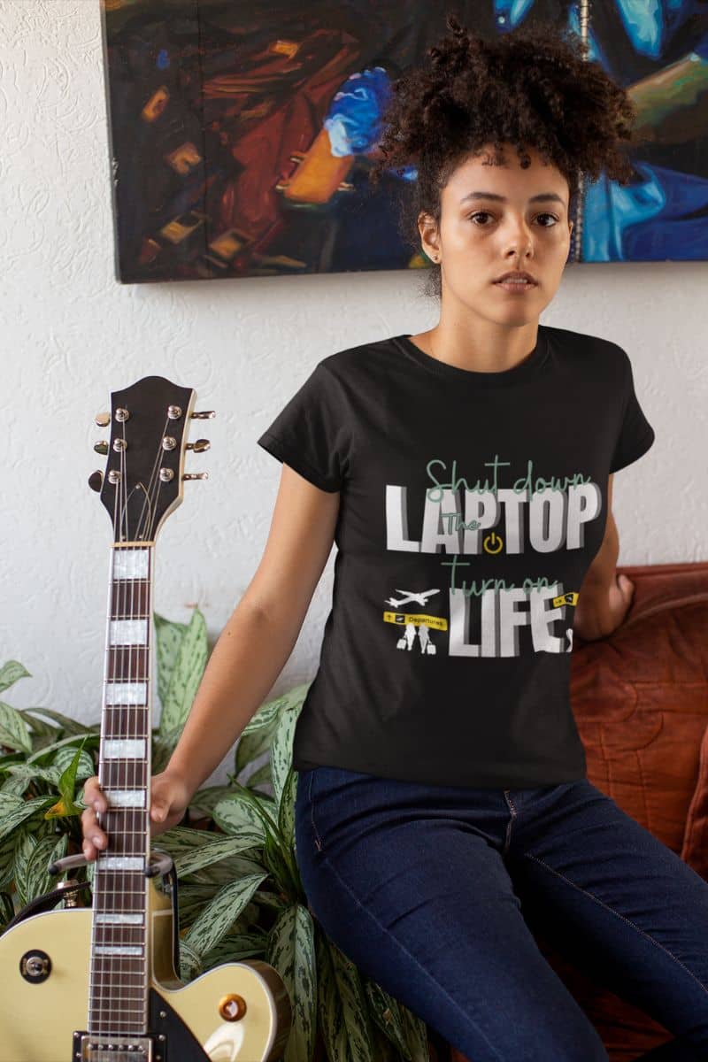 - Our Shut Down the Laptop, Turn On Life design captures the essence of escaping the digital grind.